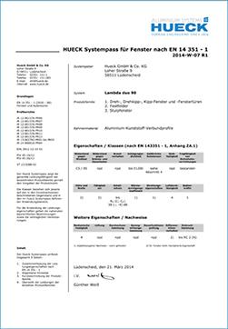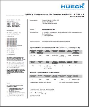 Der HUECK-Produktpass zeigt die generelle Leistungsfähigkeit der bezeichneten Produktfamilie gemäß den Vorgaben der Produktnorm. Die Klassen beziehen sich jeweils auf den in den Einzelnachweisen beschriebenen Gegenstand und in den im HUECK-Produktpass definierten Anwendungsbereich. Für die Anwendung der Leistungseigenschaften gelten die nationalen baurechtlichen Bestimmungen sowie die vertraglichen Vereinbarungen.